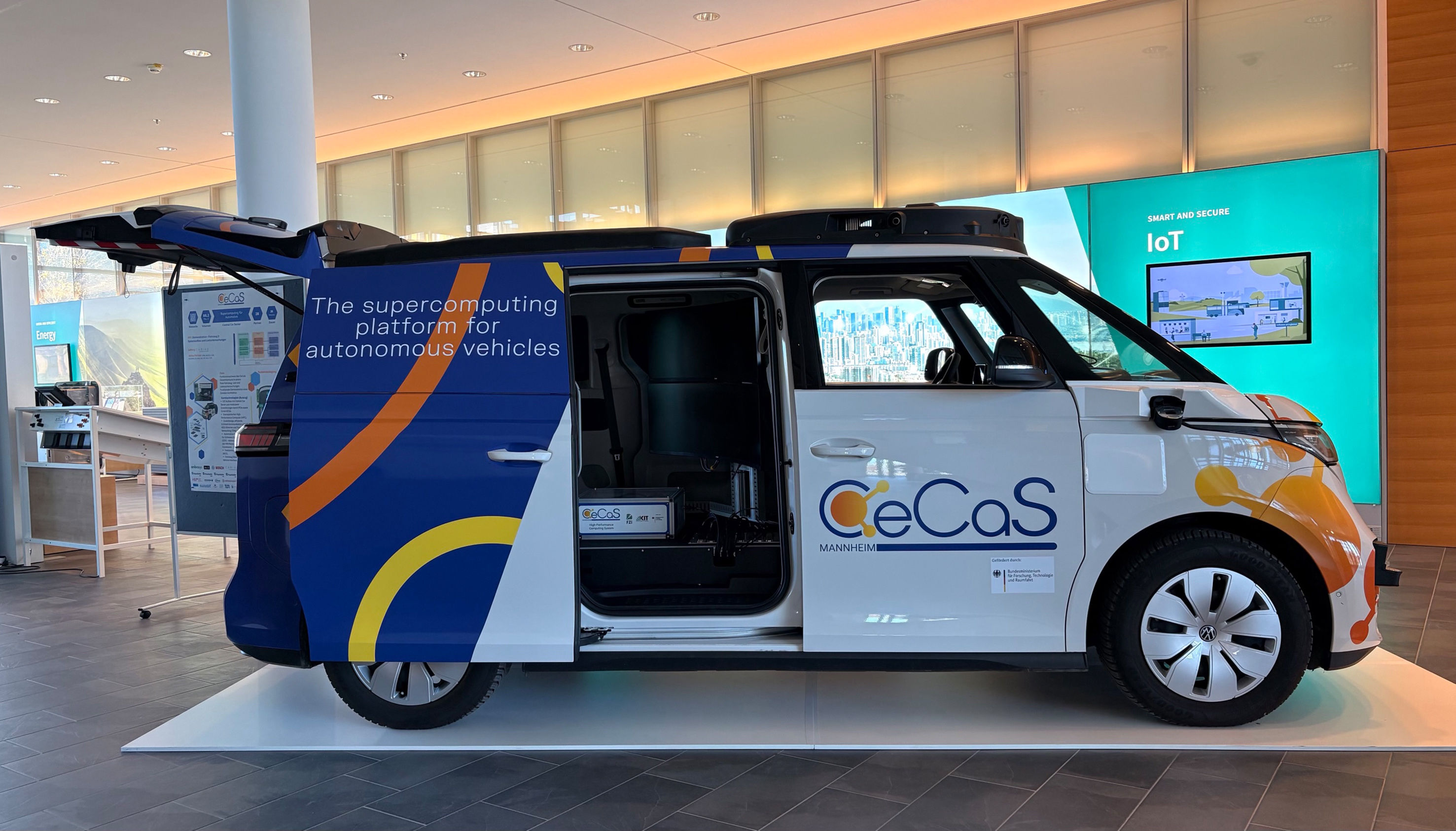 Im Forschungsprojekt Mannheim-Central Car Server (CeCaS) entwickelten 28 führende Partner aus Deutschland einen leistungsstarken und echtzeitfähigen Supercomputer für das sichere autonome Fahren. Der in einem modernen Elektroauto integrierte Demonstrator wurde bei der Projektabschlussveranstaltung bei Infineon in München präsentiert. (Foto: Infineon)