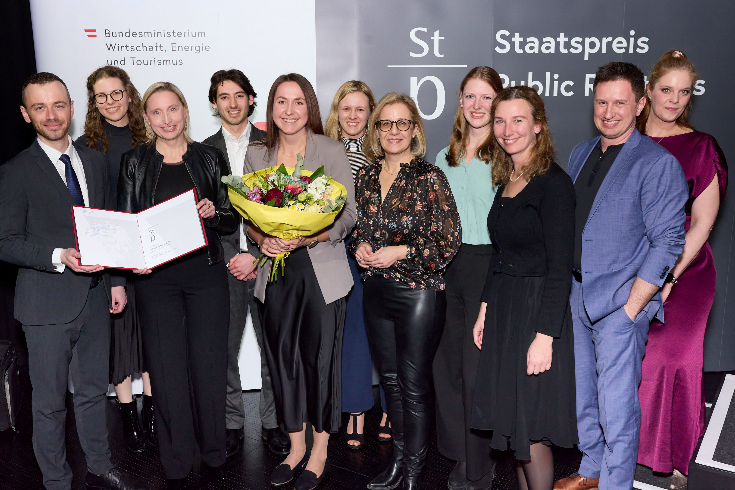 Von links: Generalsekretär des Bundesministeriums für Wirtschaft, Energie und Tourismus (BMWET) Dr. Severin Gruber, Infineon Austria Communications-Team: Maren Michl, Alexandra Wachschütz, Gabriel Chiodo, Christina Zeber, Chiara Raunig, Birgit Rader-Brunner, Sophie Zeismann, Katharina Roll, Joachim Hohenwarter, Präsidentin des Public Relations Verband Austria (PRVA) Ingrid Gogl © c_Schedl_PRVA