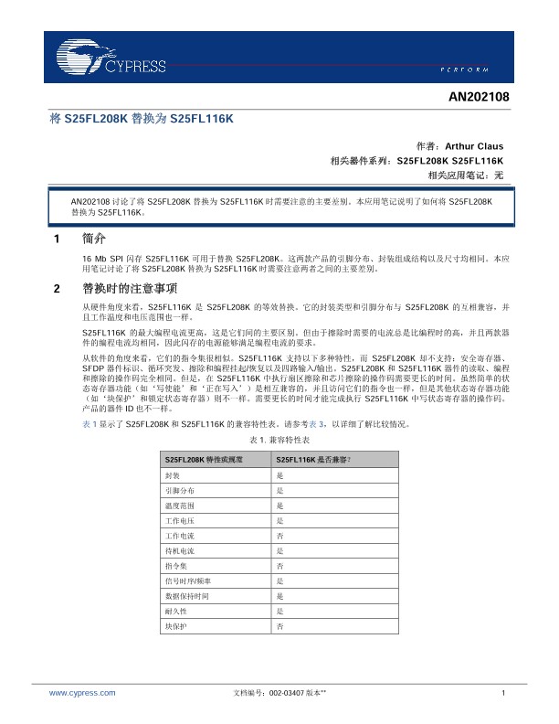 AN202108 Migrating from S25FL208K to S25FL116K (Chinese)