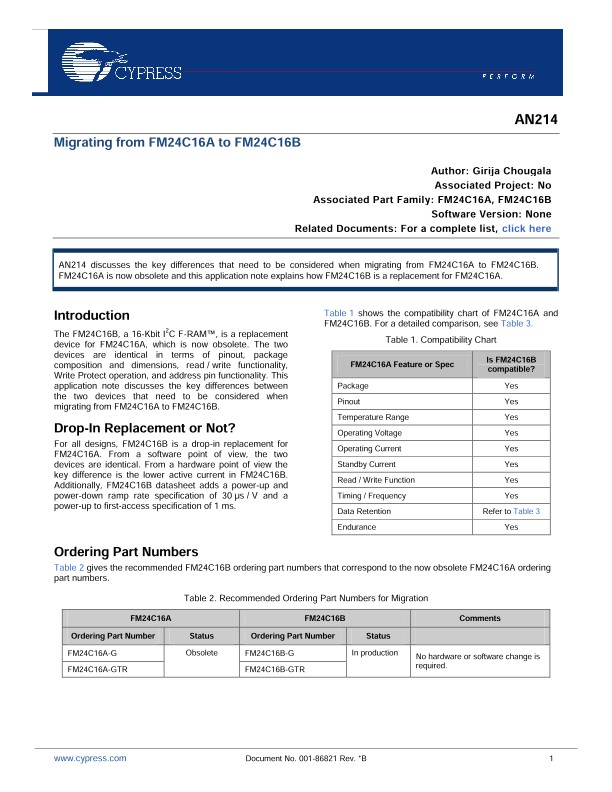 AN214 discusses the key differences which need to be considered when migrating from FM24C16A to FM24C16B.