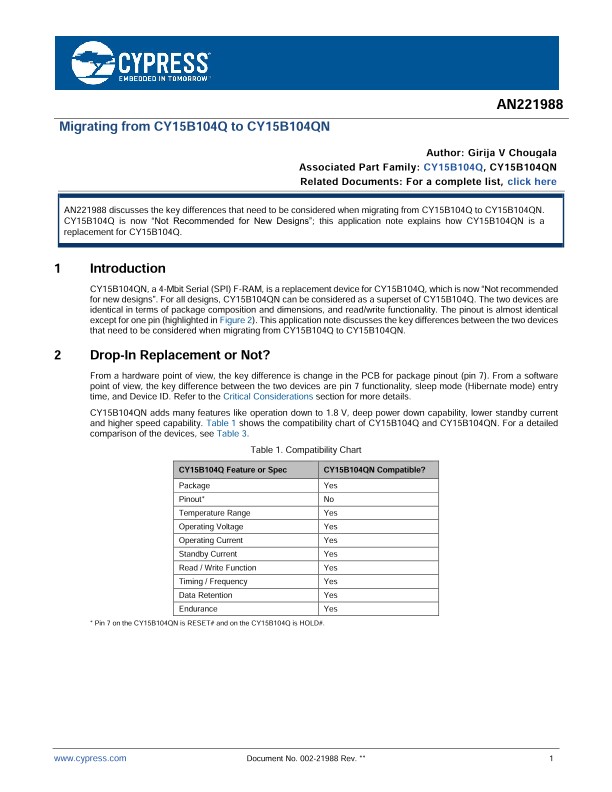 AN221988 Migrating from CY15B104Q to CY15B104QN
