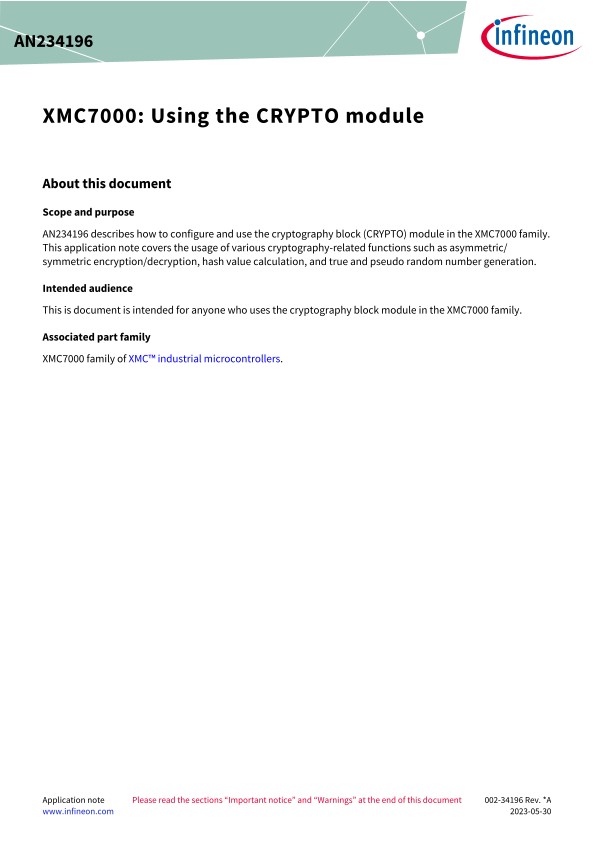 AN234196 describes how to configure and use the cryptography block (CRYPTO) module in the XMC7000 family. This application note covers the usage of various cryptography-related functions such as asymmetric/ symmetric encryption/decryption, hash value calculation, and true and pseudo random number generation.
