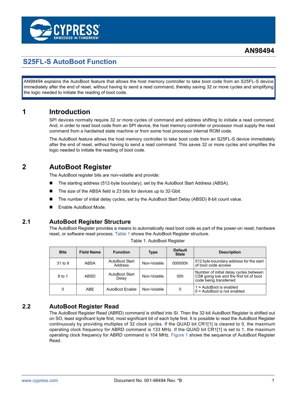 AN98494 explains the AutoBoot feature that allows the host memory controller to take boot code from an S25FL-S device immediately after the end of reset, without having to send a read command, thereby saving 32 or more cycles and simplifying the logic needed to initiate the reading of boot code.