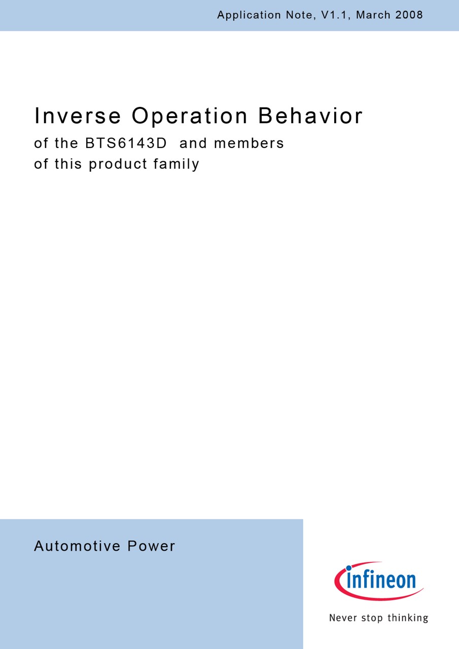 This Application Note provides information about the specific behavior of the BTS6143D and its family members for the special operation mode ìinverse operationî. The application note describes first the specific characteristics of the BTS6143D and its family members. It describes the special operation mode ìinverse operationî. It outlines the behavior of the BTS6143D diagnosis and power stage and provides background information for the special behavior. Finally this application note provides further information regarding the impact of inverse operation effects and provides hints for possible counter measures on device and system level.