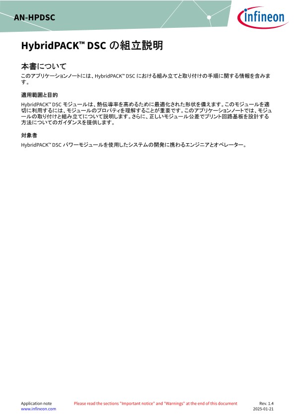 HybridPACK™ DSC モジュールは、熱伝導率を高めるために最適化された形状を備え す。このモジュー ルを適切に利用するには、モジュールのプロパティを理解することが重要です。このアプリケーション ノートでは、モジュールの取り付けと組み立てについて説明します。さらに、正しいモジュール公差で プリント回路基板を設計する方法についてのガイダンスを提供します