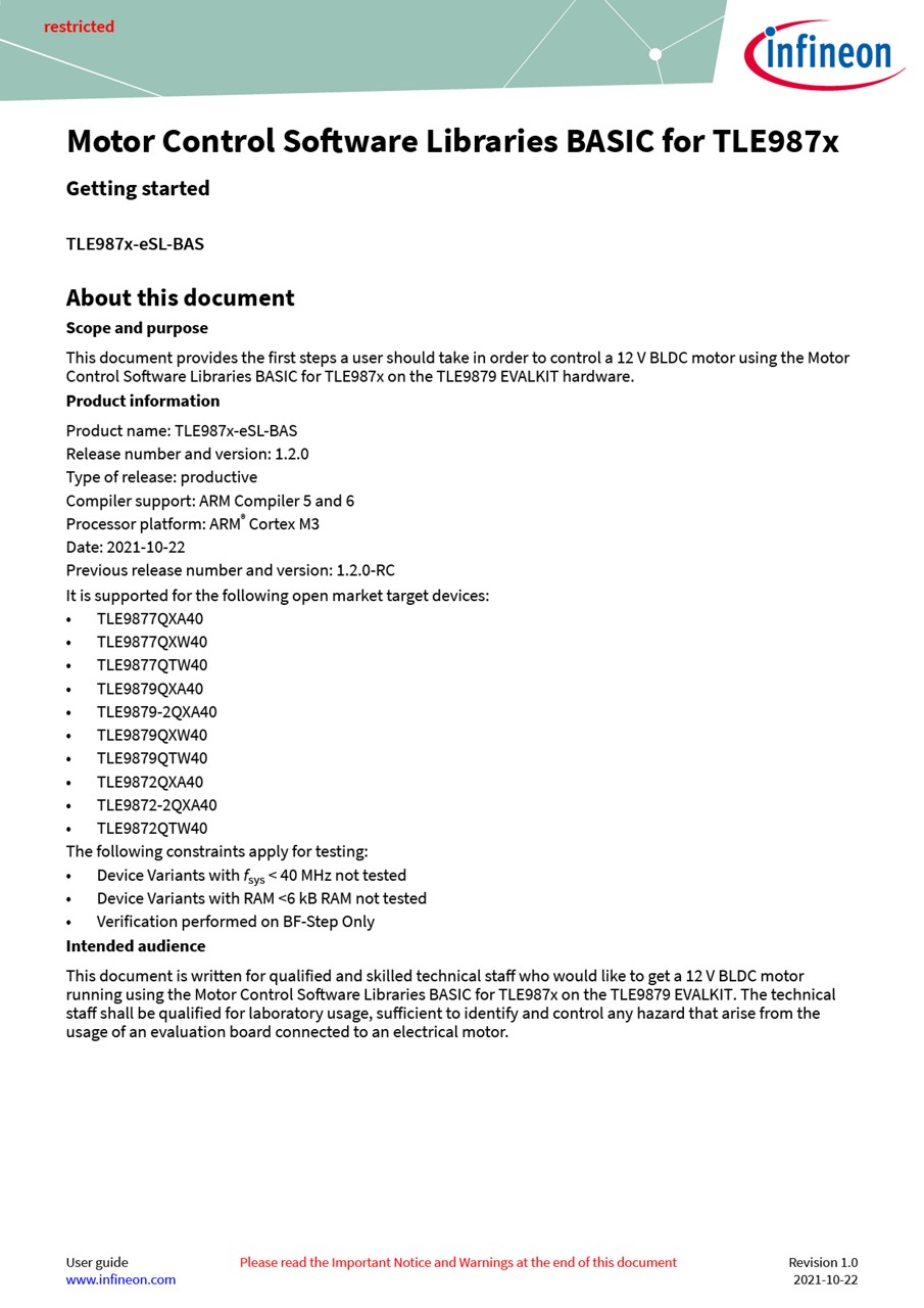 The document is a Getting Started which consists of introduction to Motor Control Software Libraries BASIC for TLE987x with a detailed overview to control 12V BLDC motor. Supported product variants are listed in detail in the document. The getting started steps are based on an application software example provided in the delivery package, named TLE987x FOC BASIC Sensorless Example. This application example integrates the relevant software components of the Motor Control Software Libraries BASIC for TLE987x and the low-level driver to run on the TLE9879 EVALKIT in a Keil® µVision® 5 software project. This software example is designed to drive a motor in two configurable control modes: • Sensorless Field Oriented Control (FOC) mode • V to F (voltage to frequency) mode Hardware and software prerequisites for the evaluation of the TLE987x-eSL-BAS Motor Control Library using the demo software example are defined in the guide in detail. In the last chapter of the document, toolchain installation is explained step by step.