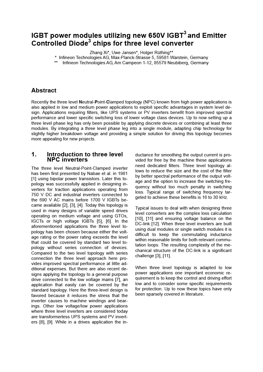 Recently the three level Neutral-Point-Clamped topology (NPC) known from high power applications is also applied in low and medium power applications to exploit specific advantages in system level design. Applications requiring filters, like UPS systems or PV inverters benefit from improved spectral performance and lower specific switching loss of lower voltage class devices. Up to now setting up a three level phase leg has only been possible by applying discrete devices or combining at least three modules. By integrating a three level phase leg into a single module, adapting chip technology for slightly higher breakdown voltage and providing a simple solution for driving this topology becomes more appealing for new projects. The three level Neutral-Point-Clamped inverter has been first presented by Nabae et al. in 1981 using bipolar power transistors. Later this topology was successfully applied in designing inverters for traction applications operating from 750 V DC and industrial inverters connected to the 690 V AC mains before 1700 V IGBTs became available. Today this topology is used in many designs of variable speed drives operating on medium voltage and using GTOs, IGCTs or high voltage IGBTs.