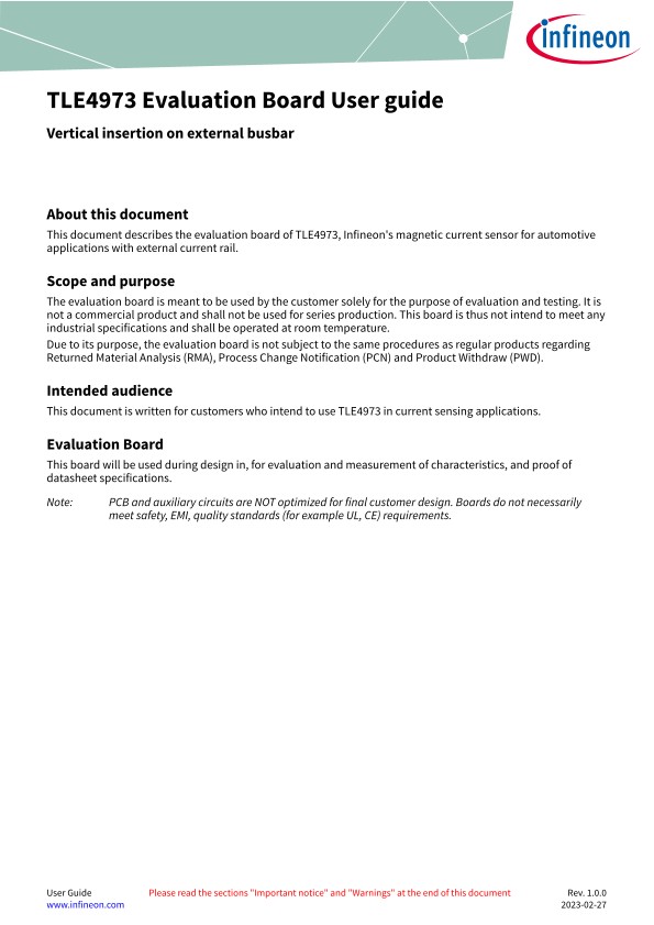 The evaluation board is meant to be used by the customer solely for the purpose of evaluation and testing. It is not a commercial product and shall not be used for series production. This board is thus not intend to meet any industrial specifications and shall be operated at room temperature. Due to its purpose, the evaluation board is not subject to the same procedures as regular products regarding Returned Material Analysis (RMA), Process Change Notification (PCN) and Product Withdraw (PWD).
