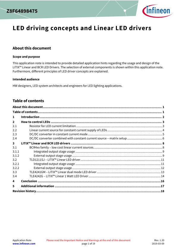 This application note is intended to provide detailed application hints regarding the usage and design of the LITIX™ Linear and BCR LED Drivers. The selection of external components is shown within this application note. Furthermore, different principles of LED driver concepts are explained.