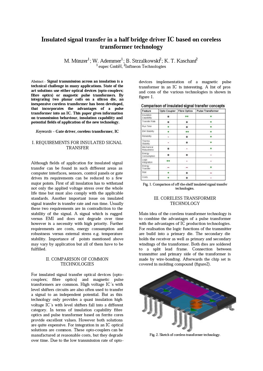 Signal transmission across an insulation is a technical challenge in many applications. State of the art solutions use either optical devices (opto-couplers; fibre optics) or magnetic pulse transformers. By integrating two planar coils on a silicon die, an inexpensive coreless transformer has been developed, that incorporates the advantages of a pulse transformer into an IC. This paper gives information on transmission behavior, insulation capability and potential fields of application of the new technology. Main idea of the coreless transformer technology is to combine the advantages of a pulse transformer with the advantages of IC production technologies. For realization the logic functions of the transmitter are built into a primary die. The secondary die holds the receiver as well as primary and secondary windings of the transformer. Both dies are soldered to a split lead frame. Connection between transmitter and primary side of the transformer is made by wire-bonding. Afterwards the chip set is covered in molding compound.