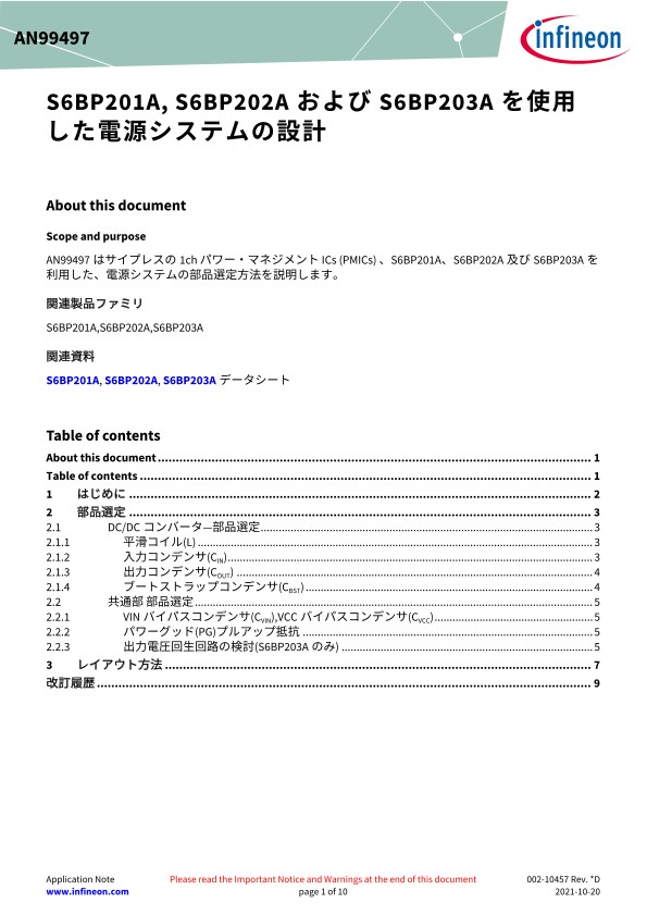 AN99497 explains how to select the components and presents PCB layout guidelines for a power management system with S6BP201A, S6BP202A, and S6BP203A, which are Infineon's one-channel power management ICs (PMICs.)
