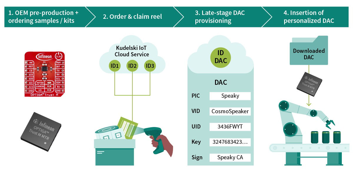 OPTIGA Trust M MTR Secure Elements are pre-provisioned at a Common Criteria-certified Infineon facility. The batch of Secure Elements on a reel is shipped with an associated barcode. The customer claims ownership of these chips on the IoT portal of Infineon partner Kudelski IoT by scanning the barcode. Kudelski IoT is a trusted and established Product Attestation Authority (PAA) approved by the Connectivity Standards Alliance (CSA). Kudelski IoT will enable the download of production DACs corresponding to the vendor and the product. Finally, the personalized DAC is transferred to the OPTIGA Trust M MTR at the factory level (see graphic).