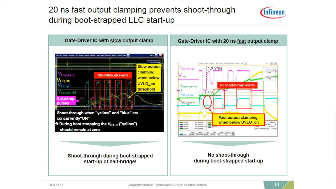 The EiceDRIVER™ 1EDN gate driver for MOSFETs is the new reference in terms of robustness and low power dissipation by combining several features. The -10 V ruggedness of the control and enable inputs provide a critical safety margin when driving pulse transformers. It is 5 A reverse output current robustness eliminates the need for Schottky switching diodes when driving MOSFETs in TO-220 and TO-247 packages. The 4.2 V and 8 V UVLO (Under Voltage Lock Out) options offer instant MOSFET protection during startup and abnormal conditions. Use of true rail-to-rail low impedance output stages to support low power dissipation.