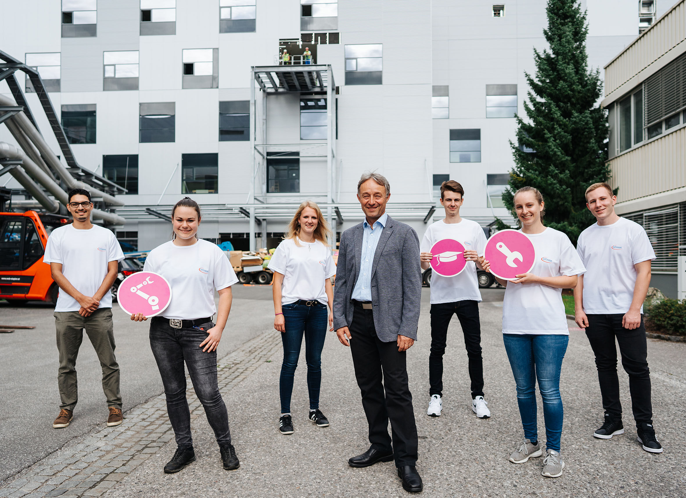 Thomas Reisinger, Operations Director at Infineon Austria with the six Infineon apprentices of the pilot model "Apprenticeship and Studies" in front of the new chip factory at the start in September 2020.