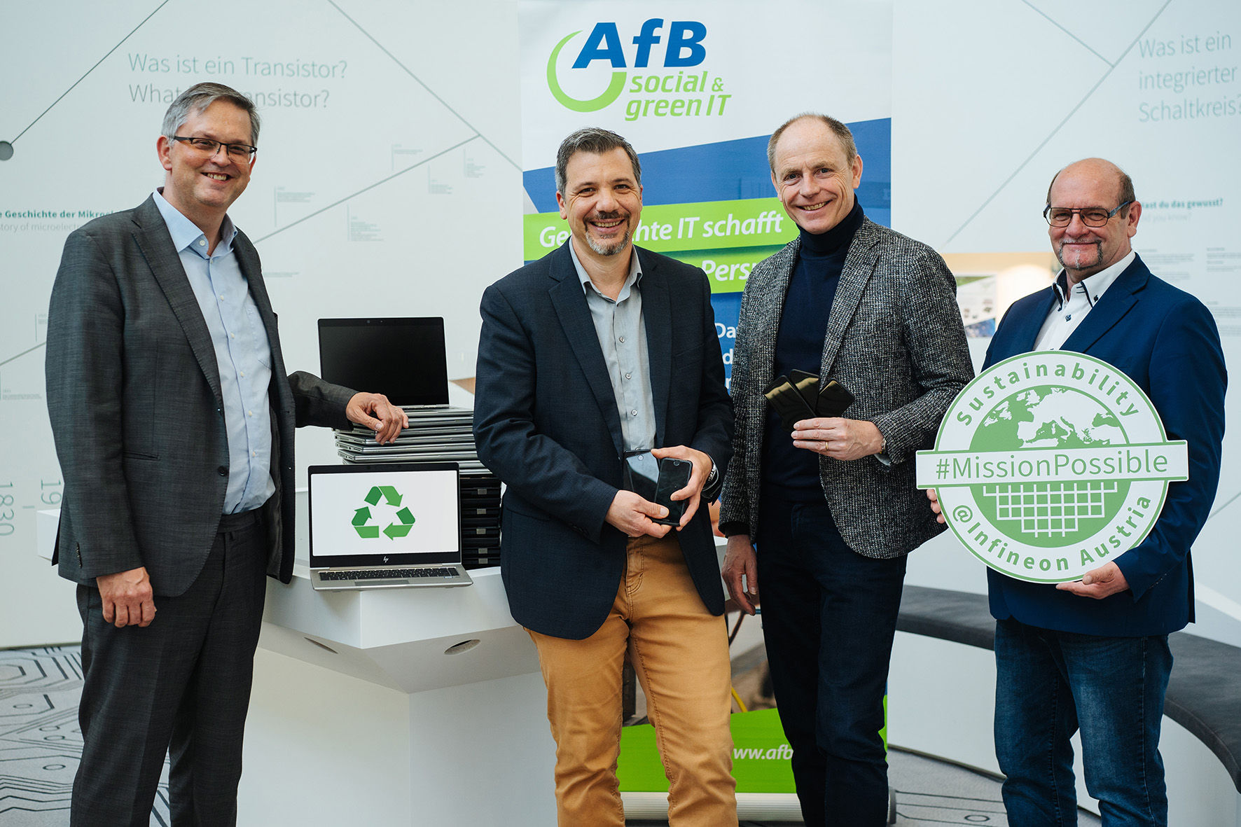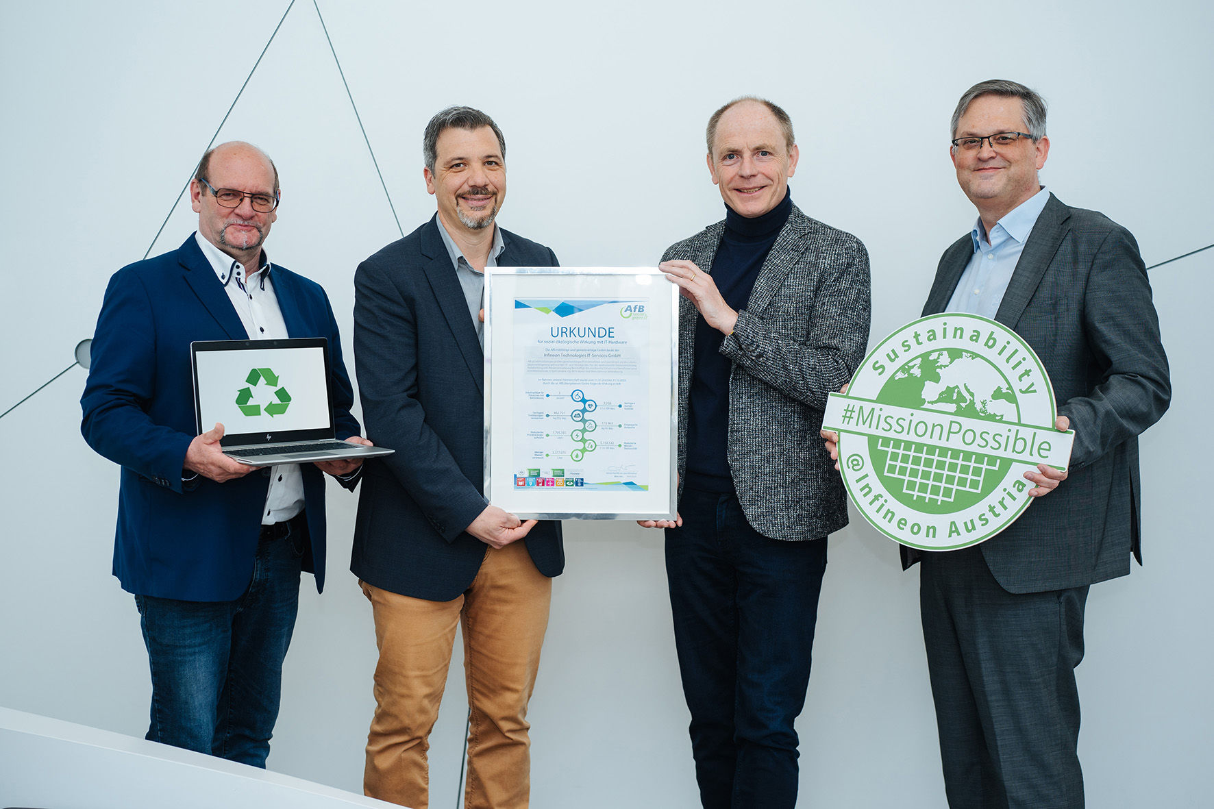With the certificate, the non-profit AfB "Arbeit für Menschen mit Behinderung" GmbH (Work for People with Disabilities) annually honors Infineon Technologies Austria AG for its socially and ecologically responsible actions. Infineon's used IT equipment is given a second life through certified recycling. The balance sheet for 2022 is impressive.