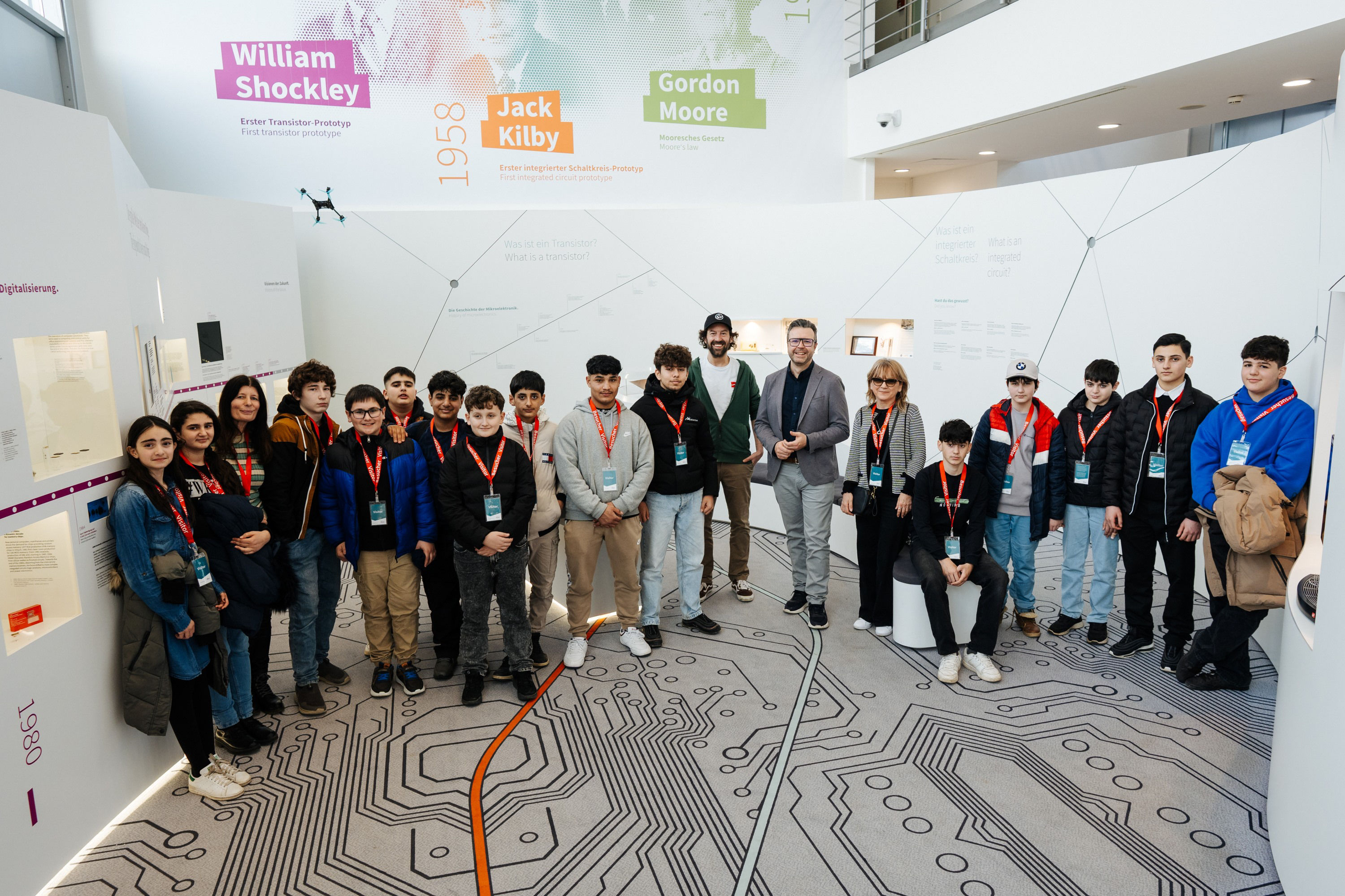 Infineon employees answered the questions of a special delegation in Villach at the beginning of February: 15 young pupils from the Caritas Lerncafé in Villach paid a visit to Infineon Austria: they spent an afternoon immersed in "the big world of very small things". During the guided tour of the factory premises, the young people experienced first-hand how microchips are developed and produced, were able to take a look inside the production halls and research laboratories and learned about the global topics of the future that are being researched with technology "made in Villach".